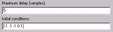 • Vector containing D elements with which to initialize memory samples U(2:D+1), where D is the Maximum delay. For a scalar input and the parameters in the next figure, the block initializes U(2:6) with values [-1, -1, -1, 0, 1].