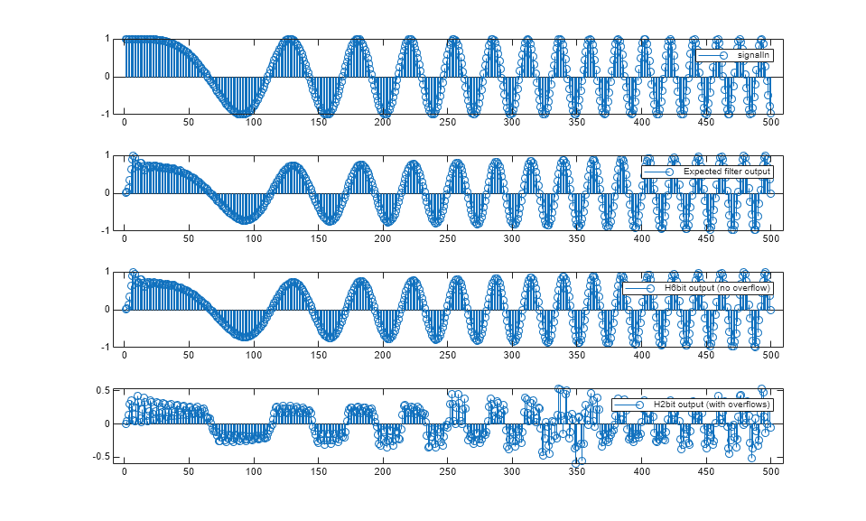 Now that you know how to choose data types that preserve the dynamic range in each section of a biquad filter and for the final output, you can explore further by changing from saturate to wrap overflow behavior. With appropriate fixed-point settings, the filter is not affected, but an over-quantized filter can have dramatic output swings. Since wrap behavior is significantly cheaper in hardware than saturate behavior, knowing how to set the quantization settings on biquad filters can save resources even with longer word lengths. The real benefit is avoiding any overflow of the denominator that would cause the filter to produce incorrect results.
