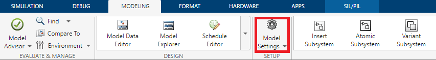 • In the model reference click the Modeling tab on the Simulink toolstrip and click Model Settings to open the Configuration Parameters dialog box.