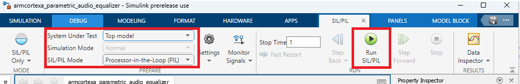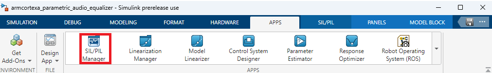 Alternatively, to run in interactive approach. In the Simulink toolstrip clicks Apps section and select the SIL/PIL Manager.