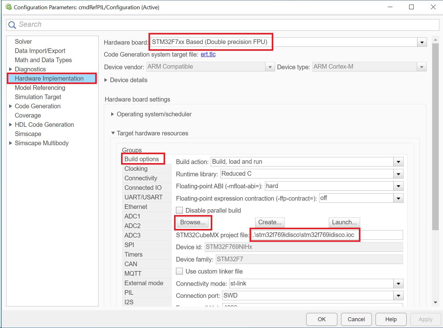 Set the Hardware board parameter to STM32F7xx Based (Double precision FPU). Under Hardware board settings, navigate to Target hardware resources and enter the serial port number to which your ARM Cortex-M hardware is connected.