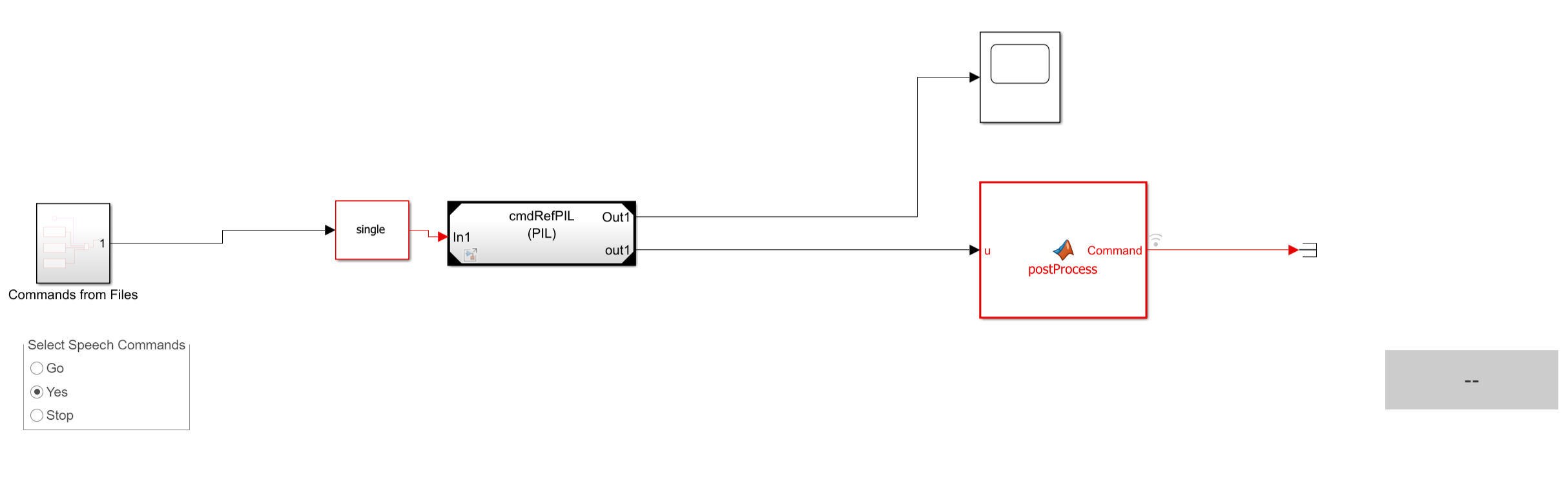 Modify the top-level model to include the reference model using a Model block. Read commands stored in audio files. For commands on file, use the rotary switch to select one of three commands (Go, Yes, or Stop).