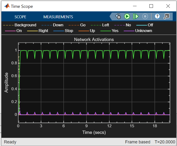 The Display block shows the recognized speech command, and the Time Scope block displays the network activations, which indicate the confidence level for each supported command.