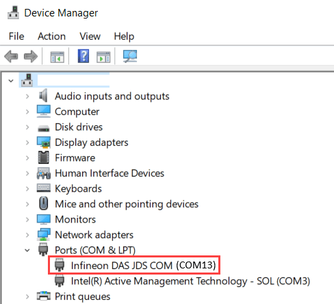 To find the COM port number of the USB Serial Port on your host computer, browse to Device Manager > Ports (COM & LPT) > Infineon DAS JDS COM to find the COM port.