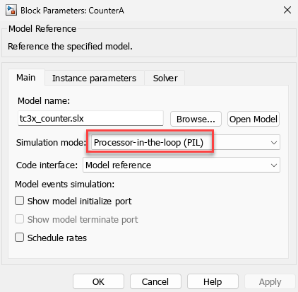 block and select Block Parameters (ModelReference).Verify if Simulation mode is set to Processor-in-the-loop(PIL) and click OK.