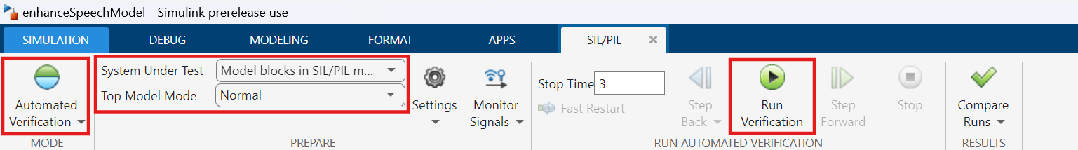 Set the System Under Test to Model blocks in SIL/PIL mode.