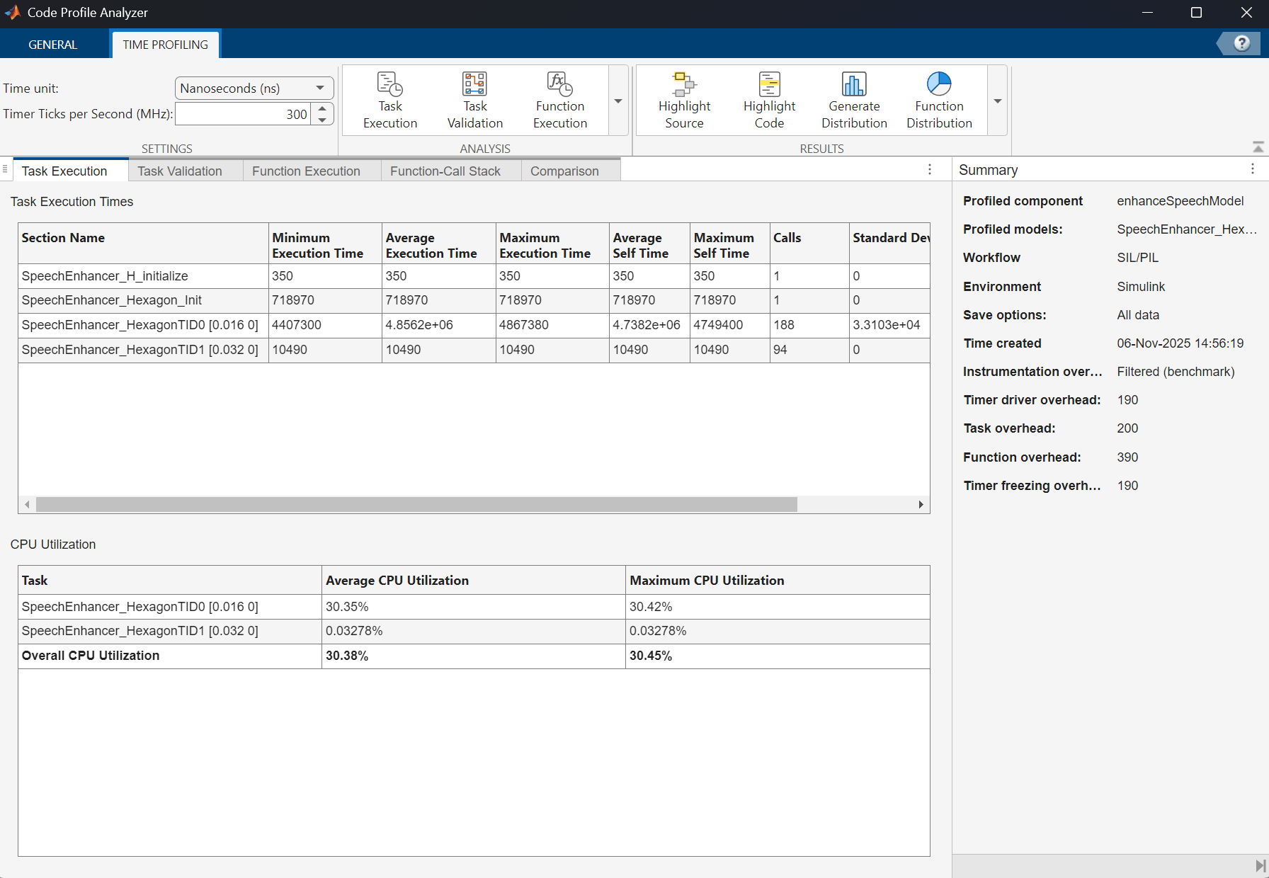 This calculation estimates the average execution time for a 1-second duration by scaling the total execution times of two step sections.The 62 calls for the SpeechEnhancer_HexagonTID0 and 31 calls for the SpeechEnhancer_HexagonTID1, are normalized based on the actual number of calls (188 and 94, respectively) during a 3-second run.