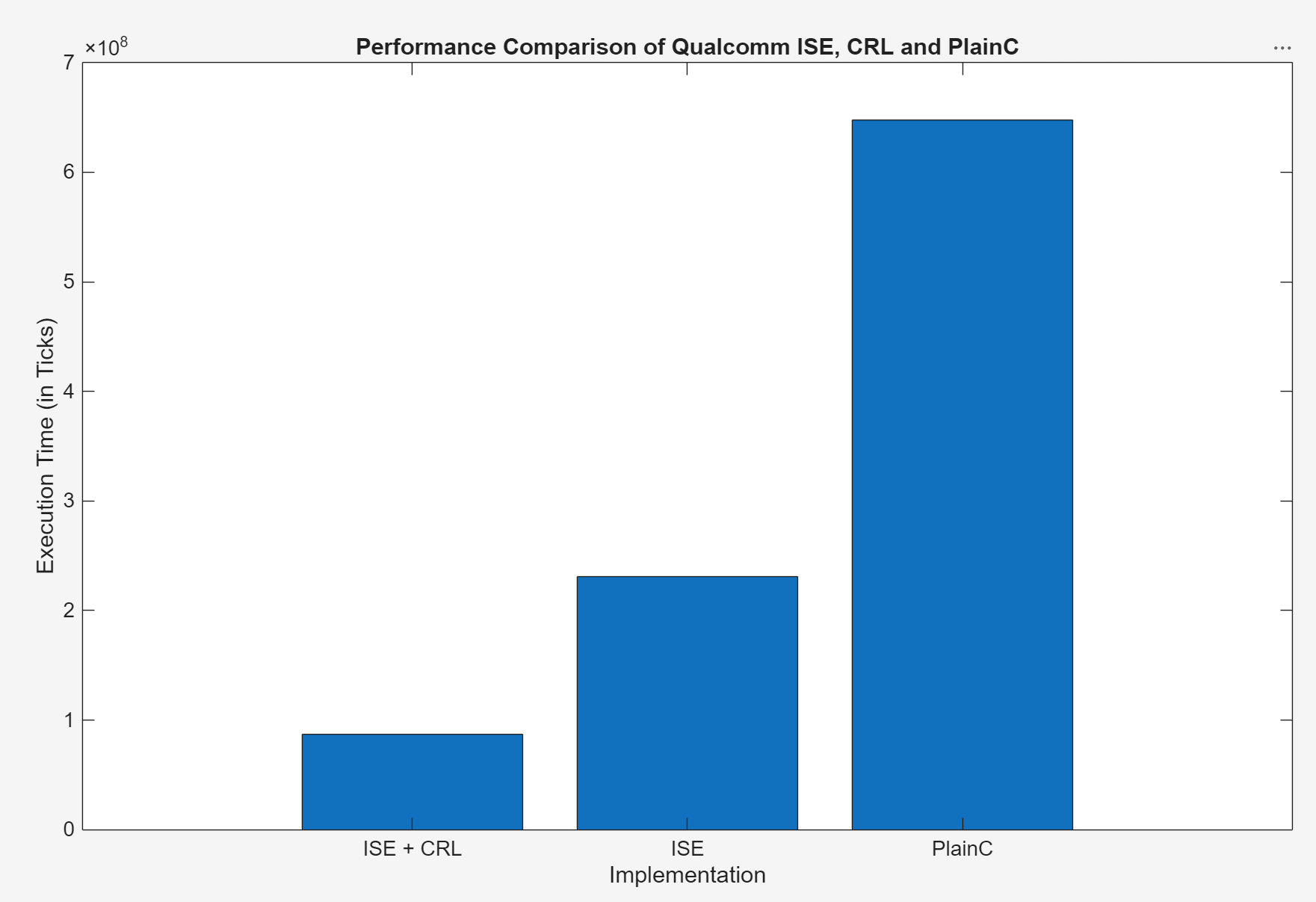 This figure shows the performance comparison between the HVX Instruction Set Extension, Qualcomm Hexagon CRLs, and Plain-C. The HVX ISE implementation achieves a performance improvement of 2.8 times over Plain-C, while the Qualcomm Hexagon CRLs combined with HVX ISE implementation is 7.4 times faster compared to plain C.
