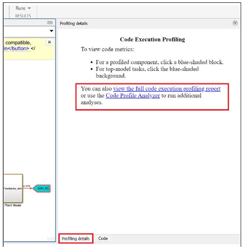When PIL simulation ends, a task profiling report is generated. You can also access this report from the bottom right corner of the model, as shown in this image