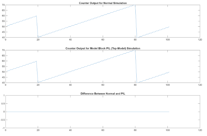 PIL mode: yout2 = out2.logsOut; yout2_pil = yout2.get('counterOut').Values.Data; xout2 = out2.xout; xout2_pil = xout2{1}.Values.Data; Normal Mode: set_param([model '/Counter'],"SimulationMode","Normal"); out2 = sim(model,20); yout2 = out2.logsOut; yout2_normal = yout2.get('counterOut').Values.Data; xout2 = out2.xout; xout2_normal = xout2{1}.Values.Data; fig3 = figure; subplot(3,1,1), plot(yout2_normal), title('Counter Output for Normal Simulation') subplot(3,1,2), ... plot(yout2_pil), title('Counter Output for Model Block PIL (Model Reference) Simulation') subplot(3,1,3), plot(yout2_normal-yout2_pil), ... title('Difference Between Normal and PIL'); fig4 = figure; subplot(3,1,1), plot(xout2_pil), title('State Logging for Normal Simulation') subplot(3,1,2), ... plot(xout2_normal), title('State Logging for Model Block PIL (Model Reference) Simulation') subplot(3,1,3), plot(xout2_normal-xout2_pil), ... title('Difference Between Normal and PIL');