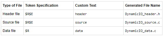 在配置参数对话框的代码生成 > 代码放置窗格中,使用自动生成的文件命名规则组自定义生成的文件的名称。当您使用 Modular 或 Compact(with separate date file) 文件打包时,您可以为生成的标头、源和数据文件指定自定义名称。当您使用 Compact 文件打包时,您可以为生成的头文件和源文件指定自定义名称。