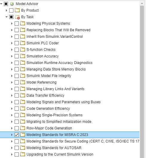 2. In the left pane, expand By Task > Modeling Standards for MISRA C:2023. If the folder is not visible, open Settings > Preferences and select Show By Task Folder.