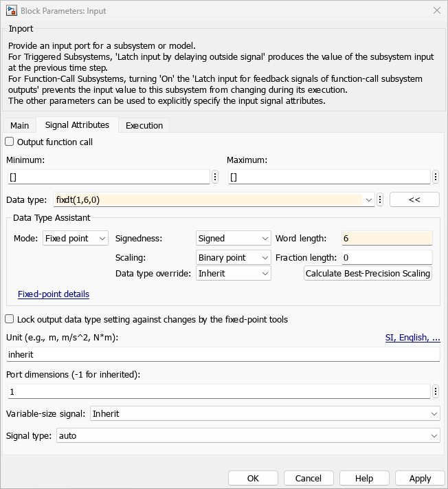 Assume that your integer input takes on a maximum value of 63 and can be represented using only six bits. To conserve memory, change the data type of the input and subsequent signals to the fixed-point data type fixdt(1,6,0).
