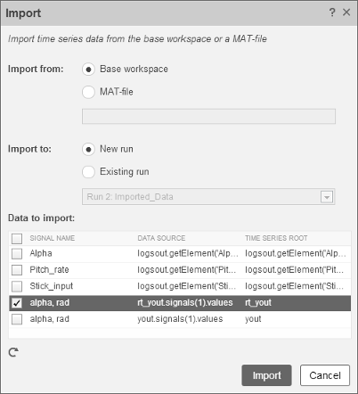 alpha,rad, import the data into the Simulation Data Inspector.On the Simulation Data Inspector Visualize tab, click the Import button to open the Import dialog.