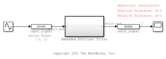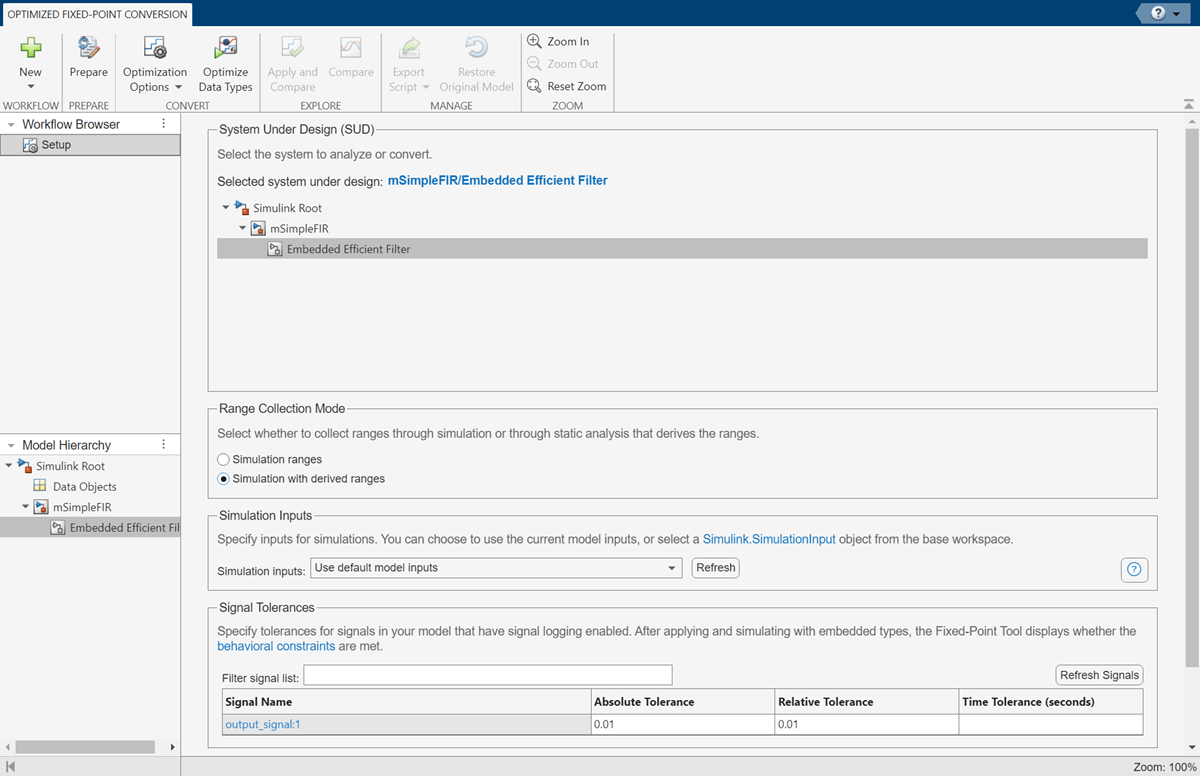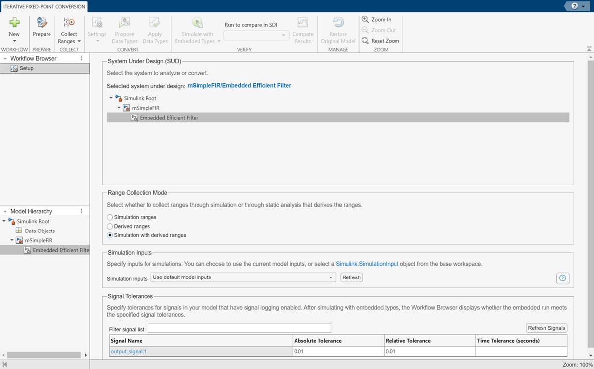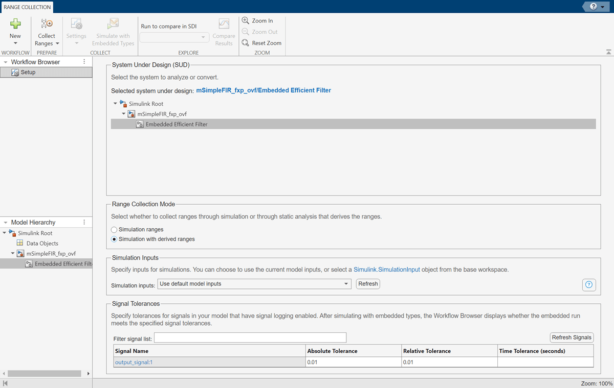 此工作流不要求您指定系统的期望行为,但建议您指定任何已知范围、仿真输入和信号容差,以便获得更准确的数据类型建议,并能够评估建议的数据类型是否满足指定的设计需求。
