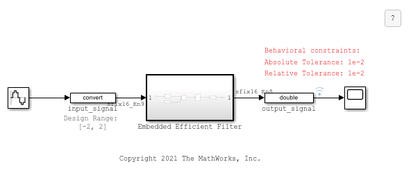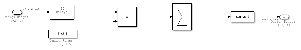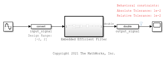 如果您的模型包含 MATLAB Function 模块,请仅使用支持的建模结构以实现成功转换。请参阅MATLAB Language Features Supported for Automated Fixed-Point Conversion。