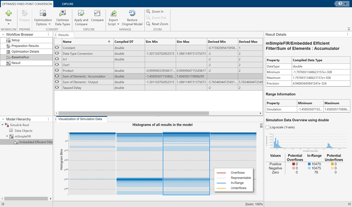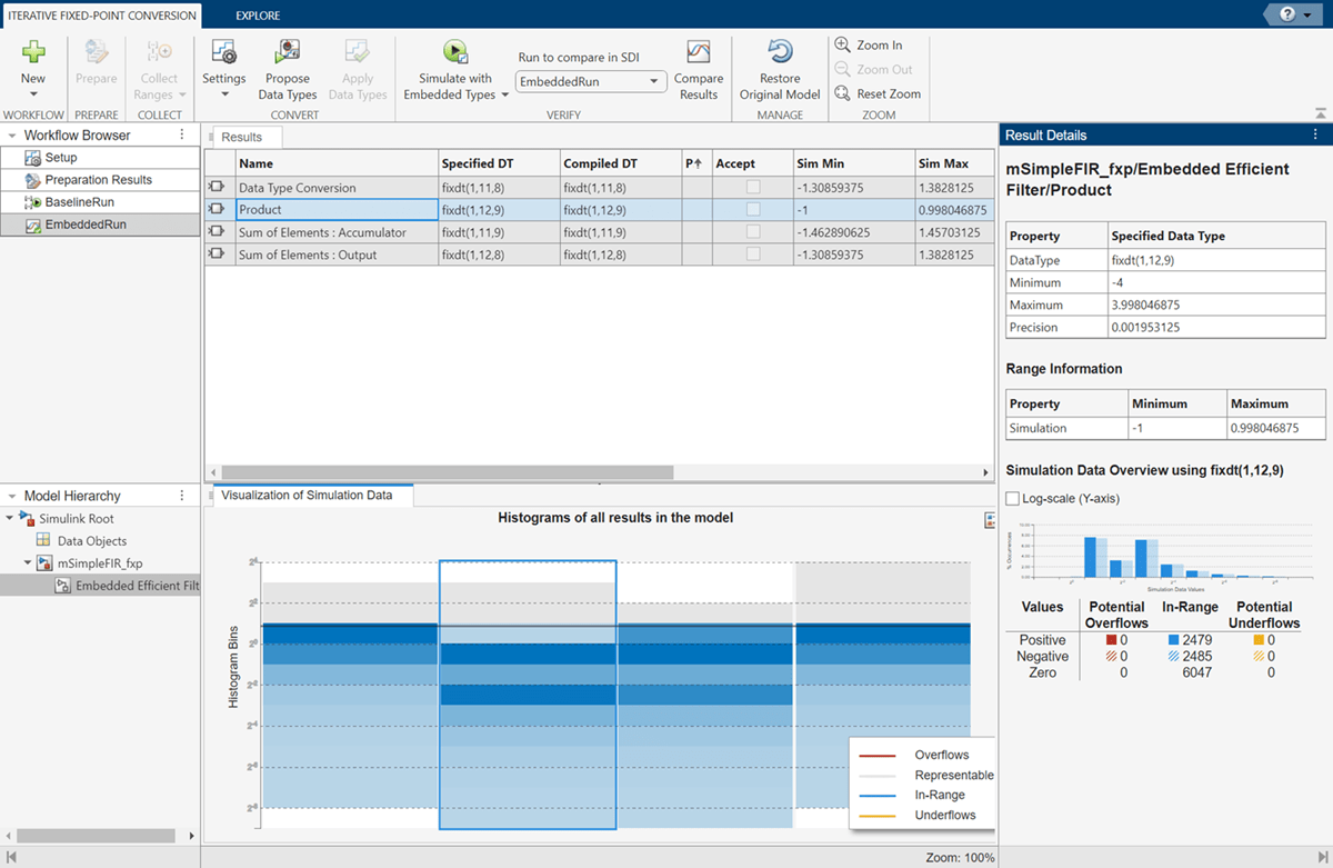 定点工具使您能够自动转换浮点模型以使用定点数据类型,优化模型上的现有数据类型,并使用丰富的统计和可视化功能分析模型上的范围和数据类型。
