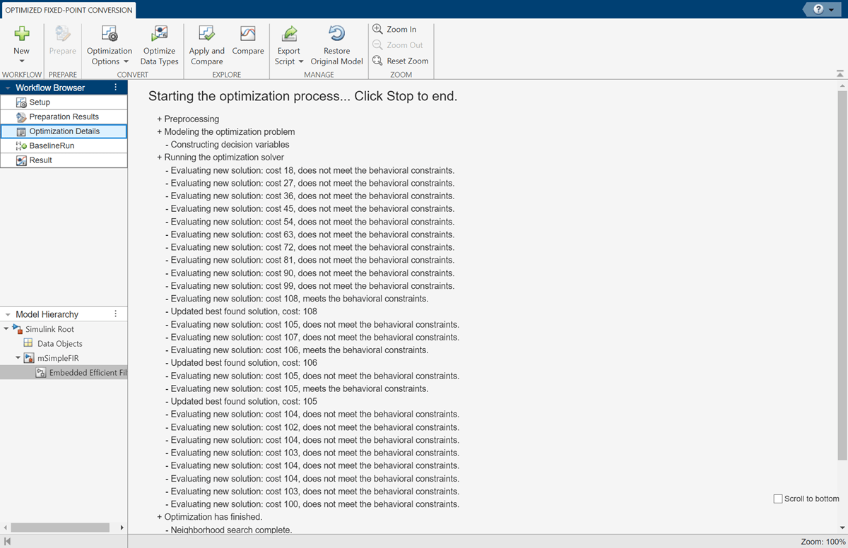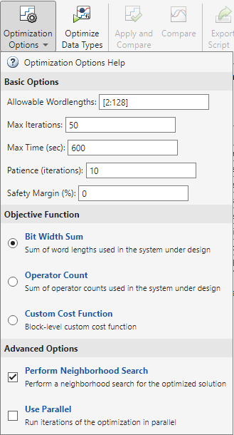 在定点工具中优化数据类型后,您可以将工作流导出到 MATLAB® 脚本。这允许您使用 fxpopt 在命令行中继续进行数据类型优化,这种方式提供了可用于进一步自定义优化过程的其他高级选项。