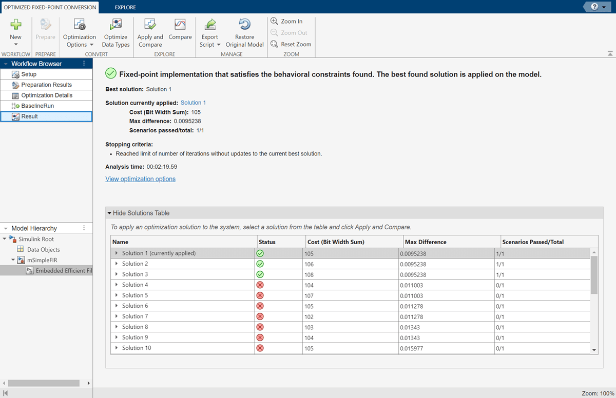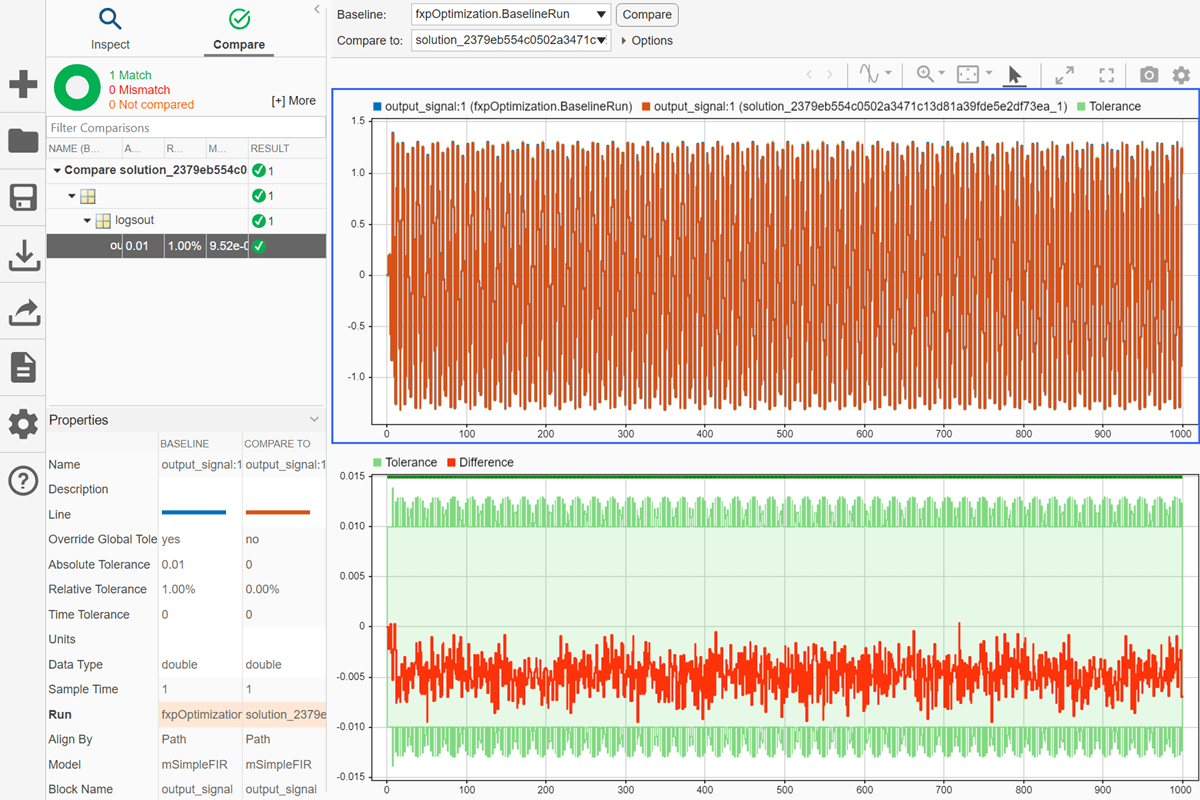 该工具允许您指定允许的字长,还会考虑您指定的目标硬件的限制。您也可以指定安全裕度,以按指定的量增大所收集范围的边界。优化后的数据类型保持在指定的行为容差内,并最小化设计成本。如果找到多个可行解,您可以对模型应用不同的解并对它们进行探索,以找到满足您需要的解。您可以使用丰富的可视化功能探索在基线模型中收集的范围和统计量,以快速发现溢出和其他数值问题的根源。您可以在仿真数据检查器中比较不同定点实现的结果。