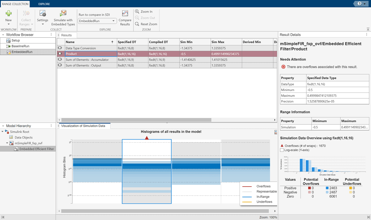 丰富的可视化功能使您能够探索模型中对象的范围,并快速发现上溢、下溢和其他数值问题的根源,无论是在转换为定点类型之前还是之后。不满足指定容差的信号在结果中会突出显示。您可以使用仿真数据检查器比较各次仿真运行的结果。