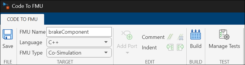 Specify the FMU Name, Language, and FMU Type in the CODE TO FMU toolstrip.