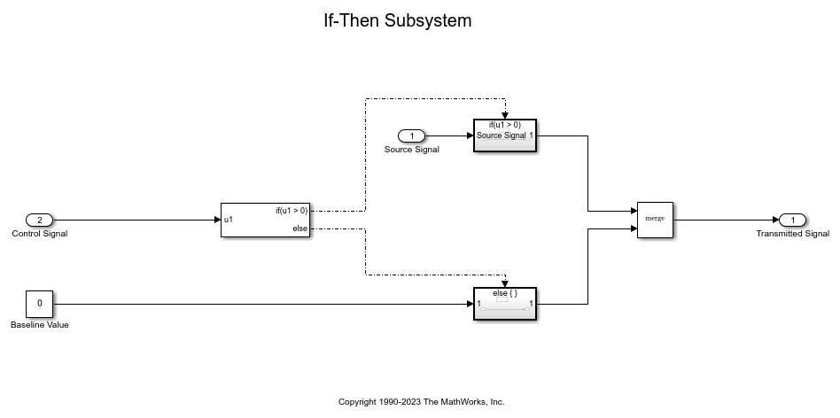 This model has two inputs, Source Signal and Control Signal. The value of the output is determined by the value of the Control Signal. The Transmitted Signal value is equal to the Source Signal value if the Control Signal value is greater than zero. Otherwise the Transmitted Signal is equal to the Baseline Value.