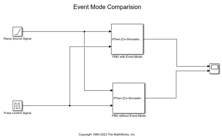 Once the FMU is generated, you can integrate it into the top model FMUEventModeComparision to compare the performance of the FMU with and without event mode.