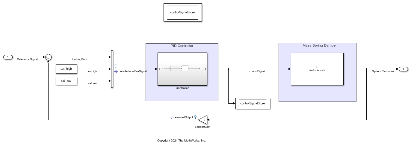 Open the massSpringDamperPISInternalVar model. This model contains a PID controller that controls the position of a mass in a mass-spring-damper system.