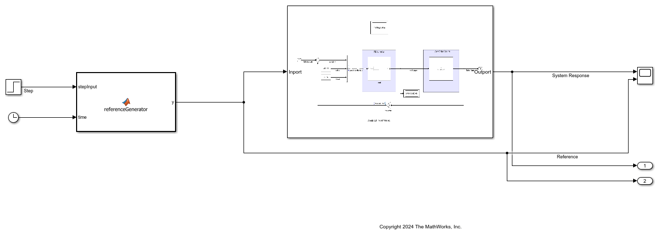 The massSpringDamperPID_modelFMU Simulink model imports the generated FMU into Simulink. The referenceGenerator function creates a reference signal for the controller to follow. The reference signal is initially a step input that sets the position of the mass to a non-zero steady state. After a specified time, the reference signal is an oscillating sine wave about this point.