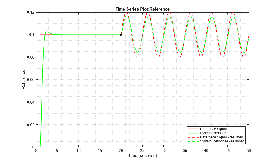 legend('Reference Signal', 'System Response', 'Refernece Signal - remused', 'System Response - resumed with new parameters', 'Location','southeast');