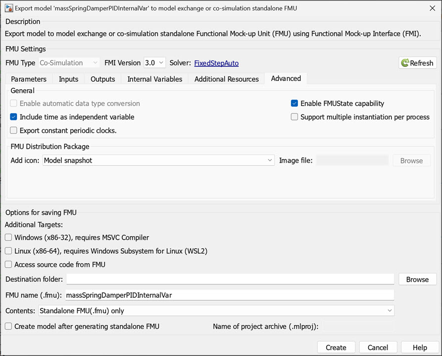 Setting System Target to FMU 'Co-Simulation' for model 'massSpringDamperPIDInternalVar'.