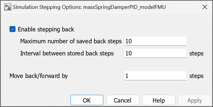 With FMUState enabled, you can also perform backward simulation stepping to step backward through major time steps of your simulation. Doing so helps you analyze and debug your model in Simulink. To learn more about simulation stepping, see Step Through Simulations Using the Simulink Editor.