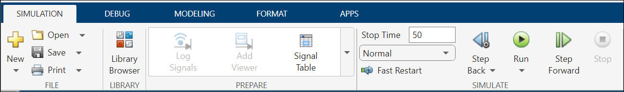 The Simulation tab of the Simulink toolstrip contains Step Forward and Step Back buttons to enable you to perform simulation stepping.