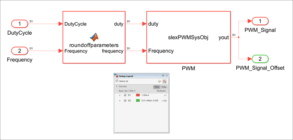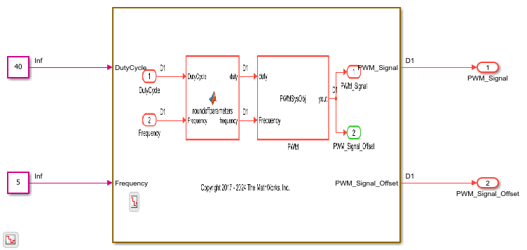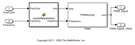 Open the model_pwm model. This model generates a PWM signal based on the specified duty cycle and frequency. For more information about this model, see Implement Block Algorithms Using MATLAB System Object and MATLAB System Block.