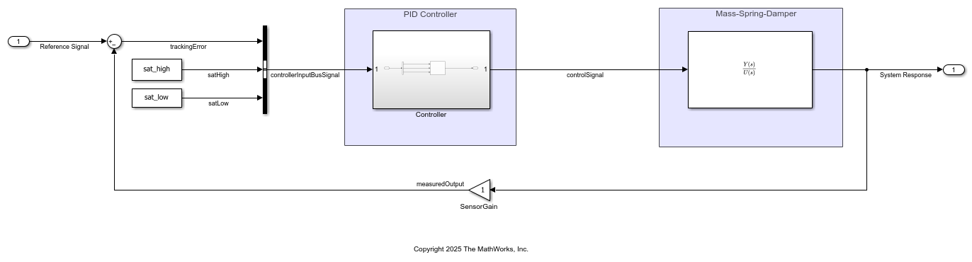 Open the massSpringDamperPIDTunableParams model. This model contains a PID controller that controls the position of a mass in a mass-spring-damper system.