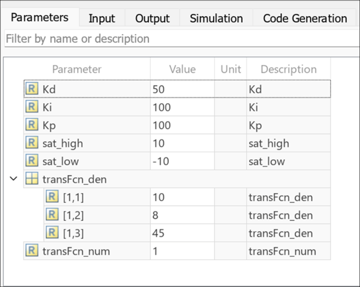 • Transfer function coefficients transFcn_num and transFcn_den in the data dictionary modelSystemTransFcn.
