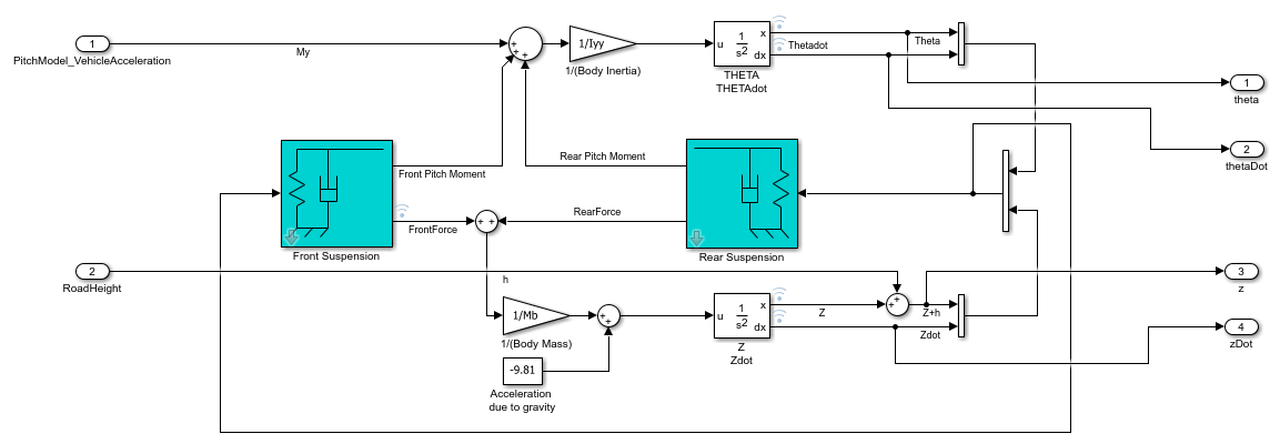 Open the suspensionModel_halfCar model. This is a simplified mathematical model of a vehicle's front and rear suspension system which can be used to study it's ride characteristics. The two inputs to this model are the pitch moment induced due to the vehicle's acceleration and the change in the road height that it travels on. For more information about this model, see Automotive Suspension.