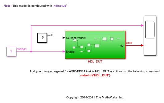 要创建一个 HDL 兼容的 Simulink 模型,请使用空白 DUT 模板。该模板使用 hdlsetup 函数针对 HDL 代码生成进行了预配置。