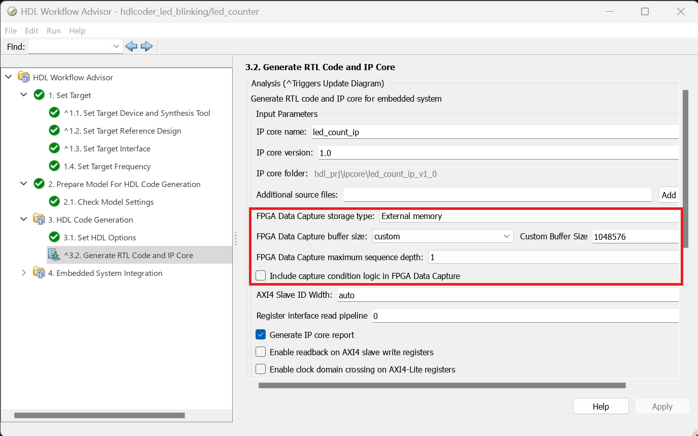5. Run through the remaining workflow steps till step 3.1. In step 3.2, you can configure these FPGA Data Capture IP parameters: FPGA Data Capture storage type, FPGA Data Capture buffer size, FPGA Data Capture maximum sequence depth, and Include capture condition logic in FPGA Data Capture.