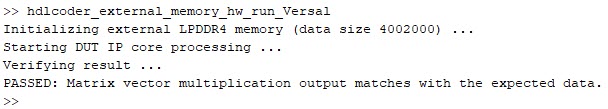 In this example, unlike the Xilinx Zynq® ZC706 Evaluation Kit and the Xilinx Zynq Ultrascale+ MPSoC ZCU102 Evaluation Kit, the Xilinx Versal™ AI Core Series VCK190 Evaluation Kit uses a different model, hdlcoder_external_memory_64bit, to access external LPDDR4 memory. Here, the DUT IP core employs a 64-bit address width to access the LPDDR4 with 8G locations through the AXI4-Master interface