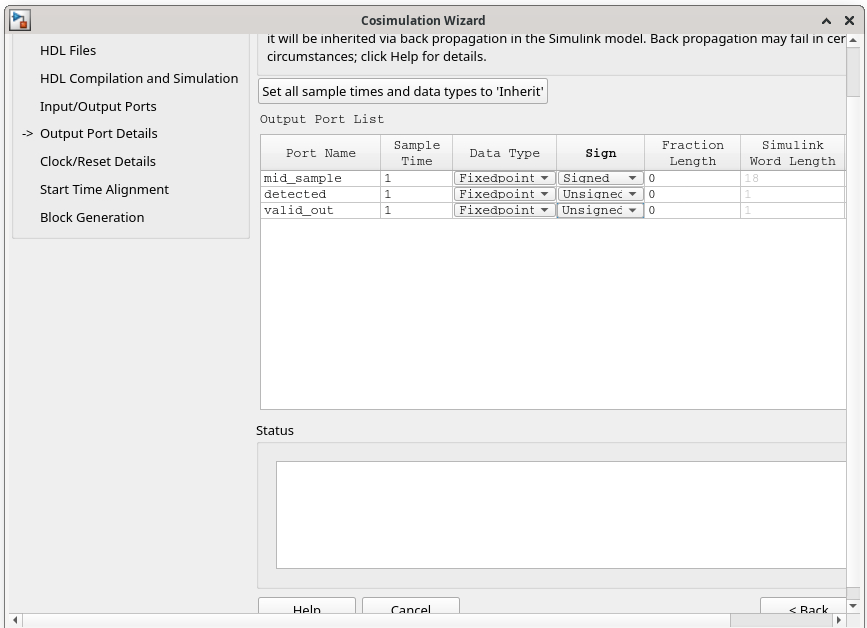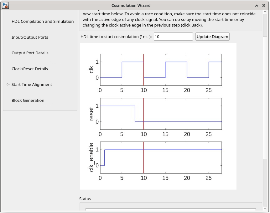 In the Start Time Alignment pane, the Cosimulation Wizard shows the HDL time to start cosimulation with a red line. The start time is also the time at which the Simulink gets the first input sample from the HDL simulator. You do not need to make any changes to the start time.