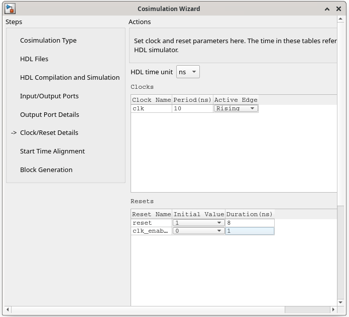 In the Clock/Reset Details pane, set clock and reset parameters. Set Initial Value for clk_enable as 0