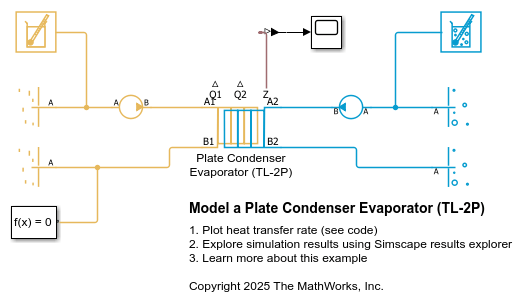 The Plate Condenser Evaporator (TL-2P) block models a plate heat exchanger between a thermal liquid and a two-phase fluid network. The block models the heat transfer between the thermal liquid and the two-phase fluid based on the effectiveness-NTU method. Heat transfer can occur in either direction between the two fluids.