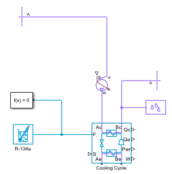 Open the model you created with a Two-Phase Fluid Predefined Properties (2P) block. Add a System-Level Refrigeration Cycle (2P) block to model the refrigeration cycle.