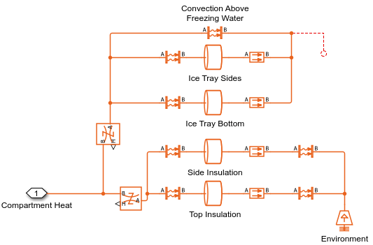Next, build the ice maker thermal network and connect it to port H of the Constant Volume Chamber (MA) block. The thermal network models heat transfer from the ambient environment to the ice compartment. Include an unconnected physical signal in the model to connect to the custom Simscape block. In this system, the: