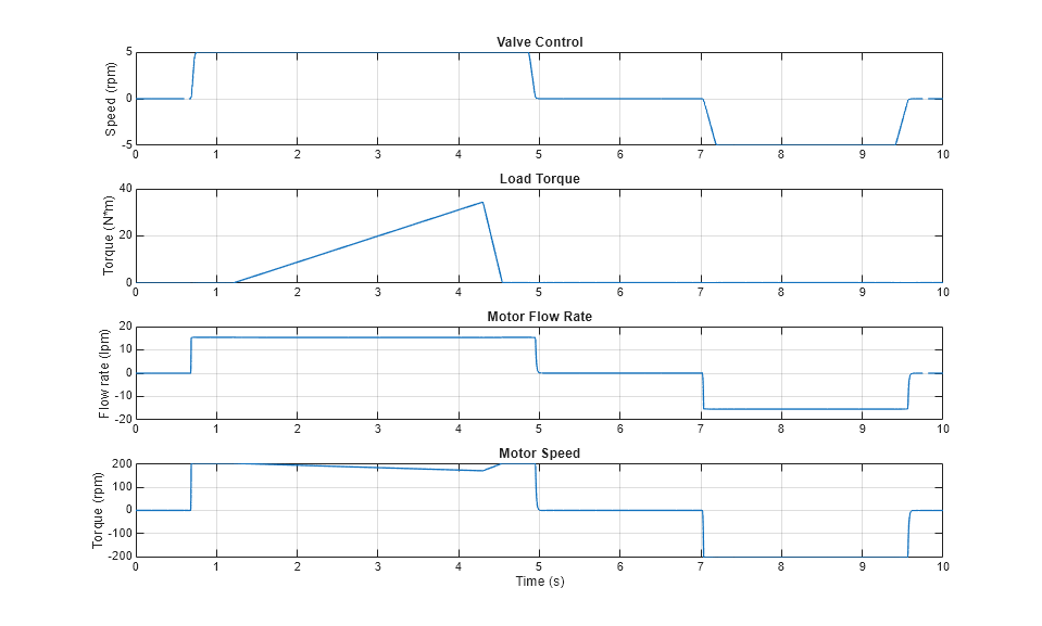 The plots below show the behavior of the motor as the valve control and load torque are varied.