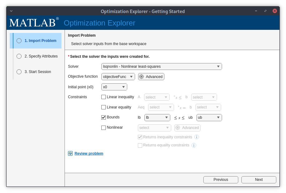 On the app menu, select Solver Inputs in the New Session section. Next, in the Import Problem step, select these options from the dropdown menus. Click Next.