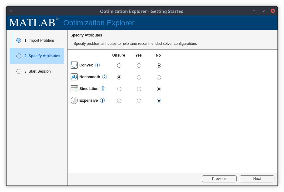 In the Specify Attributes step, check Unsure for the Nonsmooth attribute, as optical optimization problems are typically, but not strictly, nonsmooth. For this optimization problem, check No for the remaining attributes to indicate that the problem is not convex, a simulation, or expensive to compute. Click Next.