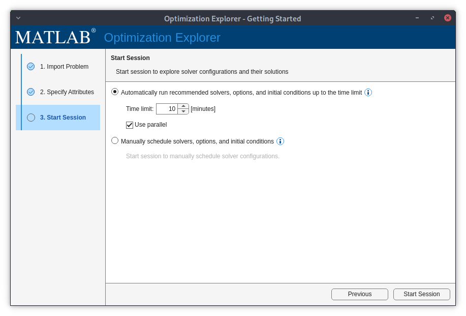 In the Start Session step, check the option to automatically run recommended solvers, and select a small time limit of 10 minutes for the first session only to ensure a correct setup. Check Use parallel if you have access to a parallel computing pool and a Parallel Computing Toolbox™ license. To set up parallel computing for optimization, see Using Parallel Computing in Optimization Toolbox (Optimization Toolbox). Later, you can increase the time limit to probe better designs. To start the optimization session, click Start Session.