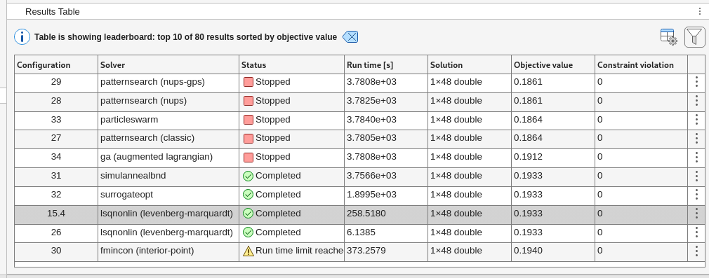While the app is running, click the Show leaderboard button in the Results Table panel to sort the results table in ascending order of the objective value, which is the merit function value. This ensures that the best solution, which will have the lowest objective value, appears in the first row of the table. If you want to pursue further improvements, choose the Manual option to schedule explicit solvers. It is beneficial to run some of the local optimizer solvers using solutions of the global solvers as the starting point. Additionally, using solutions of lsqnonlin as starting points of patternsearch can yield better solutions.
